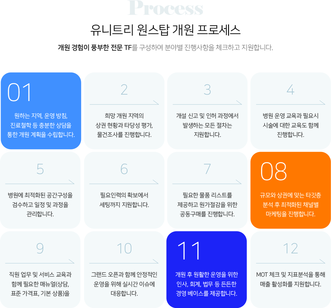 1. 병원 개원컨설팅의 역할과 중요성 병원 개원, 준비부터 마케팅까지 막막한 경우, 개원을 준비하고 계시는 분들이라면 한번쯤은 겪어봤을 것이다. 생각보다 많은 준비가 필요하고, 신경 써야 할 것들이 아주 많다. 특히 생각지도 못한 문제가 터졌을 때 혼자서 감당하기 어려운 경우도 있을 수 있다. 이런 상황을 해결하는데 무엇보다 중요한 것은 바로 경험이고, 이런 역할을 하기 위해 개원컨설팅을 전문적으로 하는 업체가 중요한 것이다. 2. 개원컨설팅, 어디까지 해주나? 개원에 필요한 모든 영역에 컨설턴트가 함께 참여하여 진행하는 것을 원칙으로 하고 있다. '이런 것까지 해준다고?' 할 정도로 개원컨설팅의 경우 깊이 관여한다. 성공개원이라는 것이 단순히 개원을 무사히 하는 것이 아닌, 안정적인 매출을 내는 것이기 때문이다. 개원컨설팅을 할 때 자금, 입지, 인테리어, 인사 등 모든 영역에 깊은 지식을 필요로 하는 이유이기도 하다. 3. 개원컨설팅 전문 퍼플메디 는? 퍼플메디 개원컨설팅은 독자적인 개원 프로세스를 바탕으로 병원 개원과 운영의 모든 과정을 아우르는 컨설팅을 제공하고 있다. 개원을 원하는 지역의 입지분석부터 시작하여, 병원 동선을 고려한 인테리어, 의약품 및 의료기기 구매, 운영에 필요한 인력 구성, 허가 사항 체크, 가격 전략 및 세팅, 더불어 효과적인 병원 마케팅까지 병의원의 성공적인 개원과 안정적인 운영을 위한 모든 분야를 종합적으로 진행하는 병의원 개원 컨설팅을 전문으로 하고 있다.